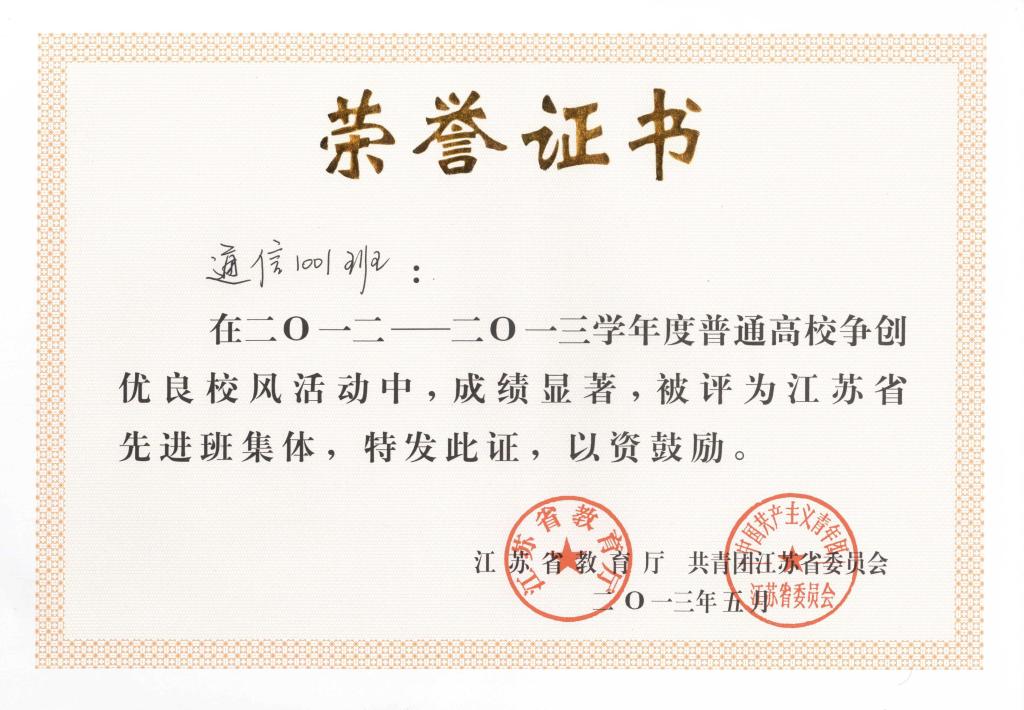江苏省先进班级-通信1001