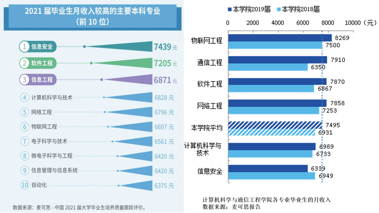 近三年本专业毕业生在全国人才需求量排行榜上一直稳居前列,就业前景广阔,就业毕业生主要集中在长三角及北广深一线城市,众多毕业生进入字节跳动、阿里巴巴、腾讯等互联网头部企业就业,薪酬收入在各专业中居于前列。如图2所示,为麦可思报告中对毕业生收入所做的调查。