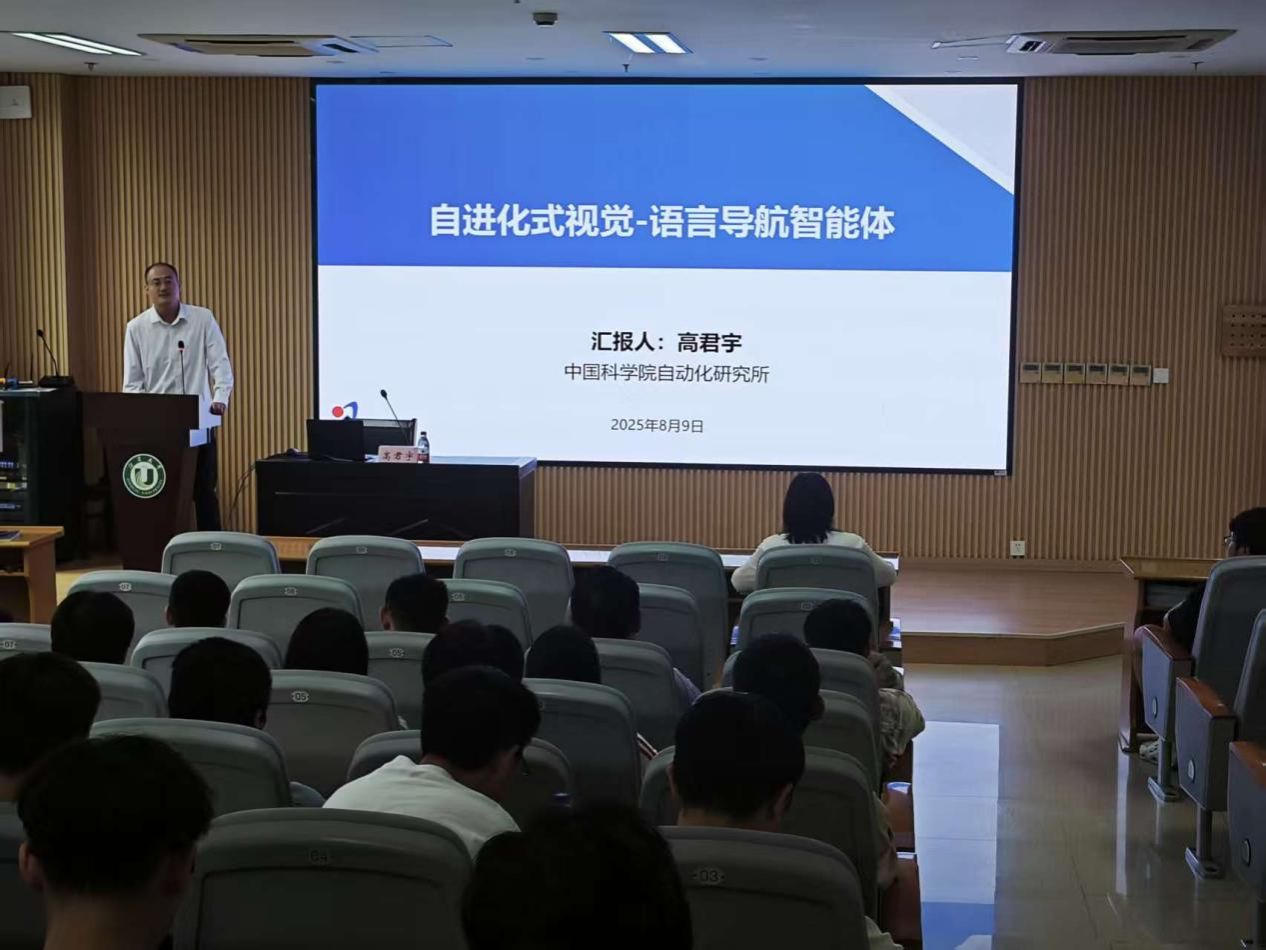 此次报告的主题是自进化式视觉-语言导航智能体。高老师指出,发展具备自主导航和行动能力的智能体已成为当下研究热点。他在报告中介绍了团队在视觉-语言导航等基础性具身任务中如何构建智能体的自动进化和环境感知机制,包括三个代表性工作:(1)研究视觉-语言导航的测试时自适应更新策略,实现模型动态更新的适应性-稳定性均衡;(2)构建动态演化的视觉-语言导航世界模型,提升对环境内部表征和未来动作预测的动态学习能力;(3)探索了一种脑启发的具身进化智能体构建范式,协调多模态大模型和世界模型,实现了多种具身任务的有效性能提升。