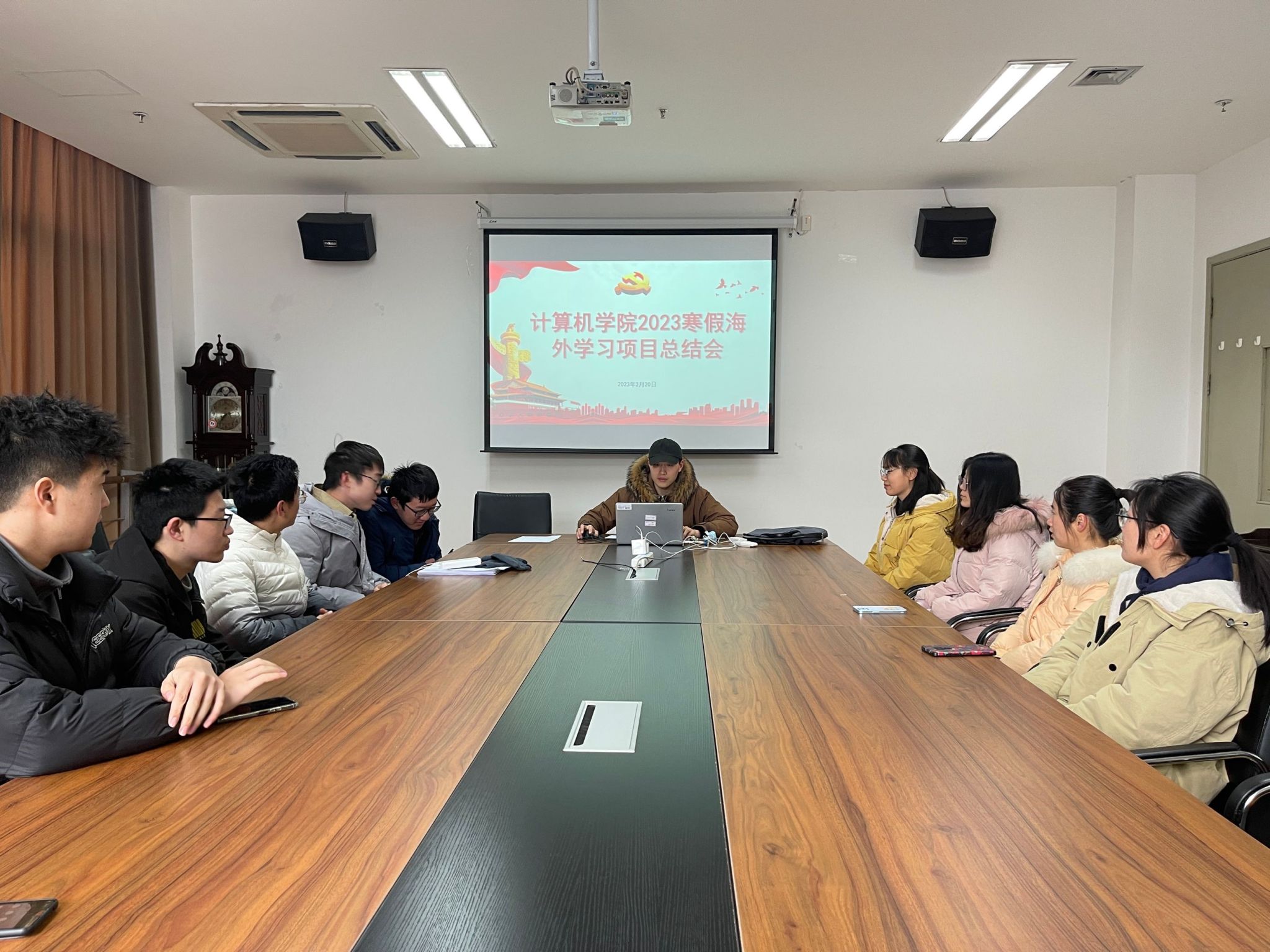 在计算机楼221召开2023年寒假海外交流项目总结分享会,会议由辅导员邱伟兵主持,报名参加项目课程的同学参会。