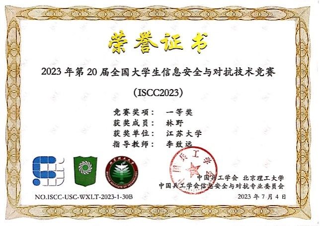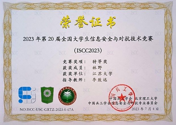 Since the launch of the 20th ISCC competition, Teacher Li Zhiyuan has led more than 20 participating students to actively strive and bravely compete, achieving excellent results in three tracks: personal challenge, unlimited arena competition, and data thinking competition, which lasted for 25 days. Lin Ye, a student majoring in Information Security at Jiangsu University, won the ISCC Individual Challenge Track Special Award and the ISCC Unlimited Arena Track First Award (no special award is set for this track);
