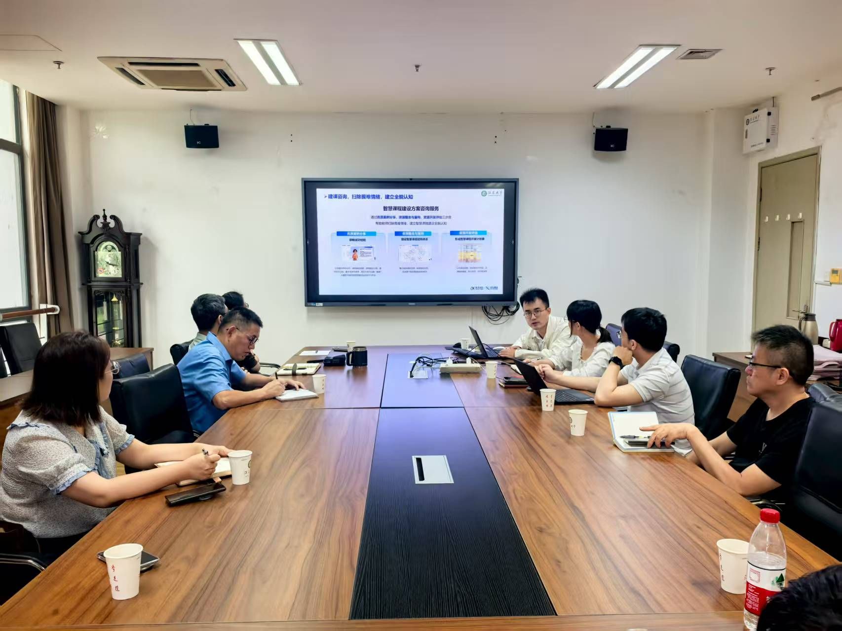 During the discussion session, faculty members focused on key topics in smart course development, including the construction of knowledge graphs, the use of AI teaching assistants and digital human tools, and the transition toward intelligent teaching evaluation. The exchange was constructive and forward-looking.